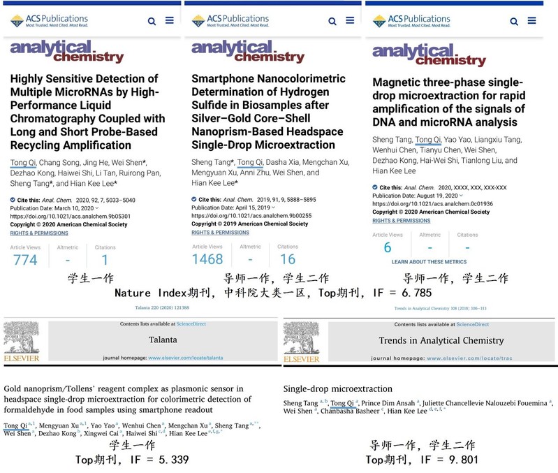 祁桐同学的硕士研究课题主要关注纳米材料增强微萃取技术在生物分析过程的应用。其开发的多种磁性催化双功能纳米材料在传统微萃取方法中发挥了独特的分离和信号扩增作用。其设计的相关方法学在食品中硫化物检测,血液中核酸分析等实际应用中获得了有效的验证。