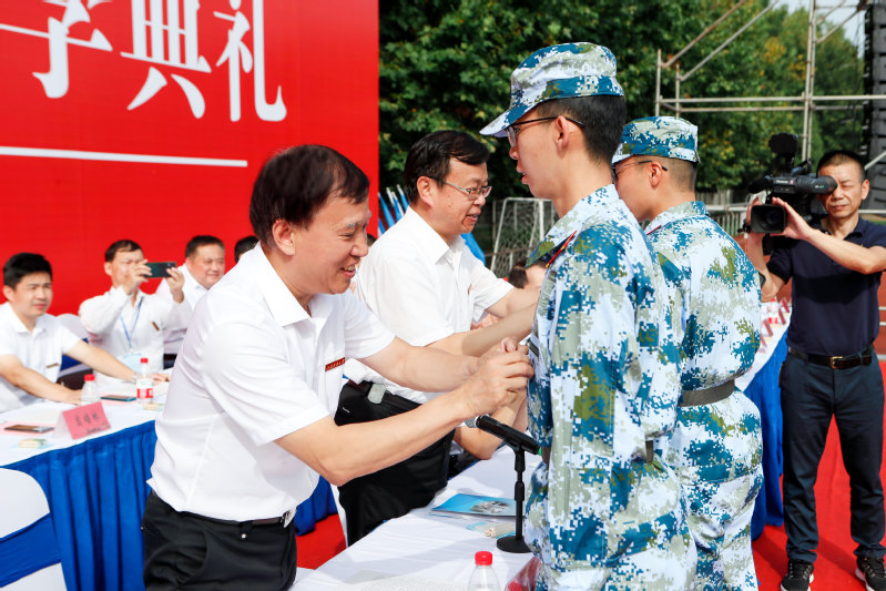 校党委书记葛世伦、校长周南平给2020级本科生代表、管理科学与工程类新生沙晏民,海洋工程类新生徐开开颁授MILAN.COM米兰(中国)校徽,“一入科大门,一生科大人”,此刻起,2020级新生就是江科大的主人。