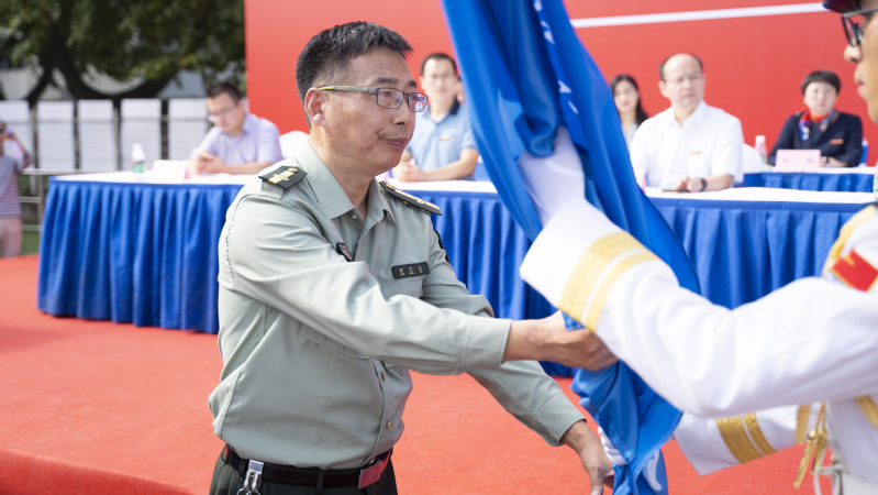 动员讲话前,姜校长向军训旅旅长蒋宏志授军训旅旗,蒋宏志向各营授营旗。