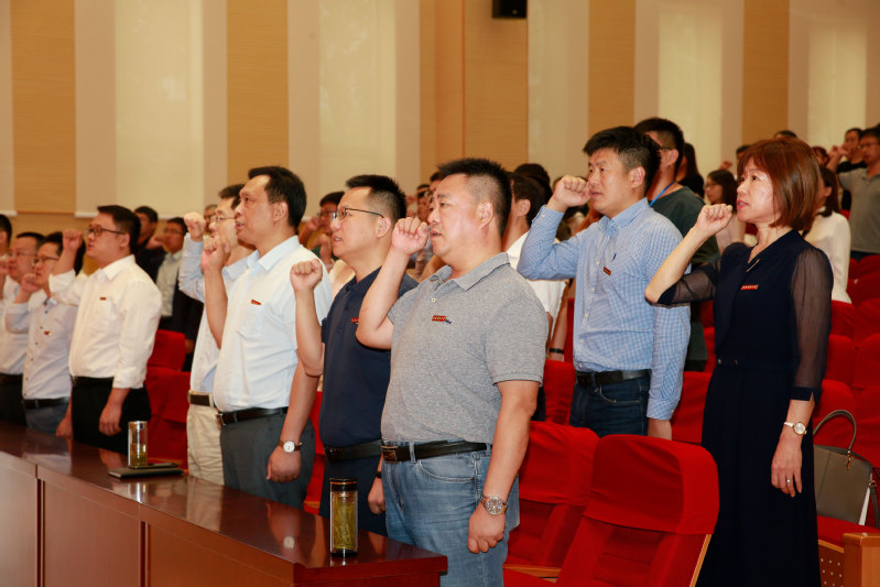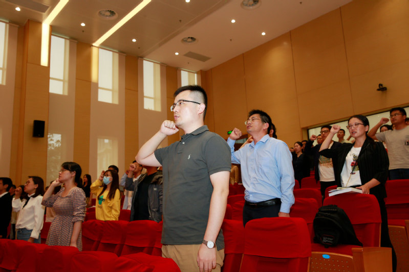 周南平校长为新教师代表张春雨博士颁发校徽。计算机学院景国良老师带领全体新教师庄严宣读《MILAN.COM米兰(中国)师德公约》,激励新同事树立崇高的职业理想和坚定的职业信念,将全部精力和满腔热情奉献给祖国的教育事业。