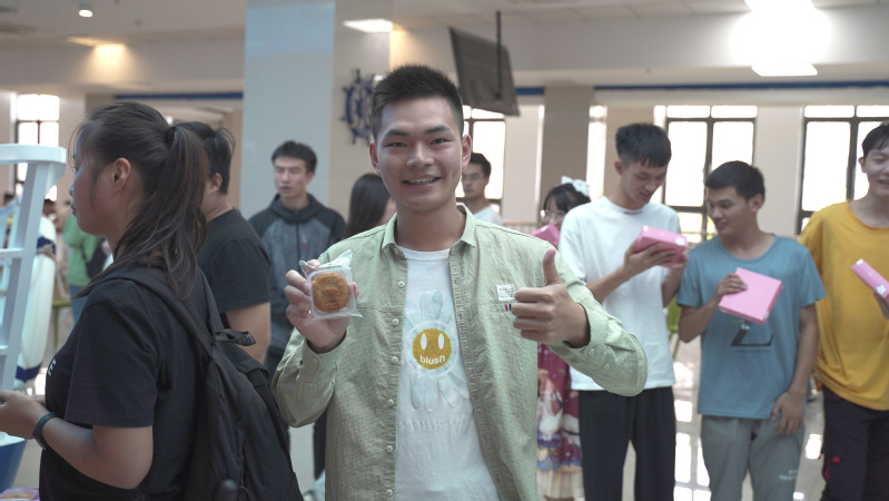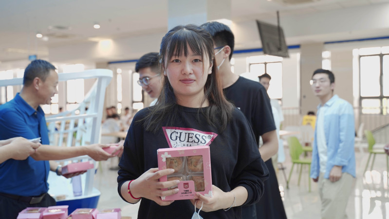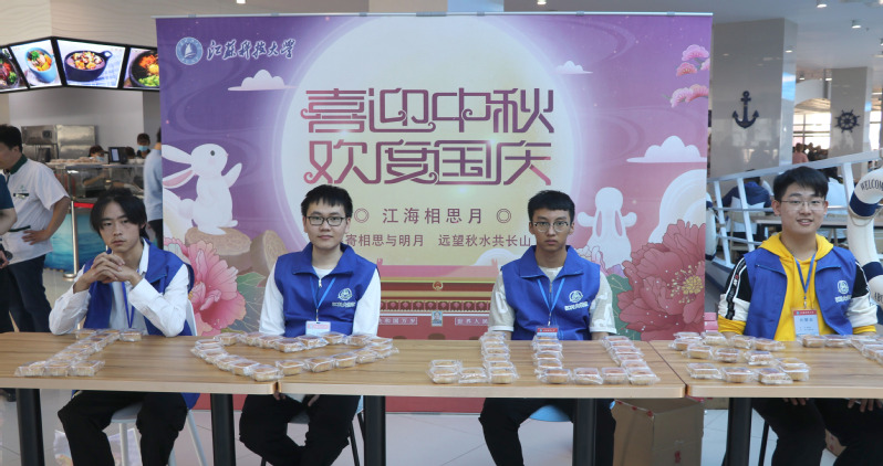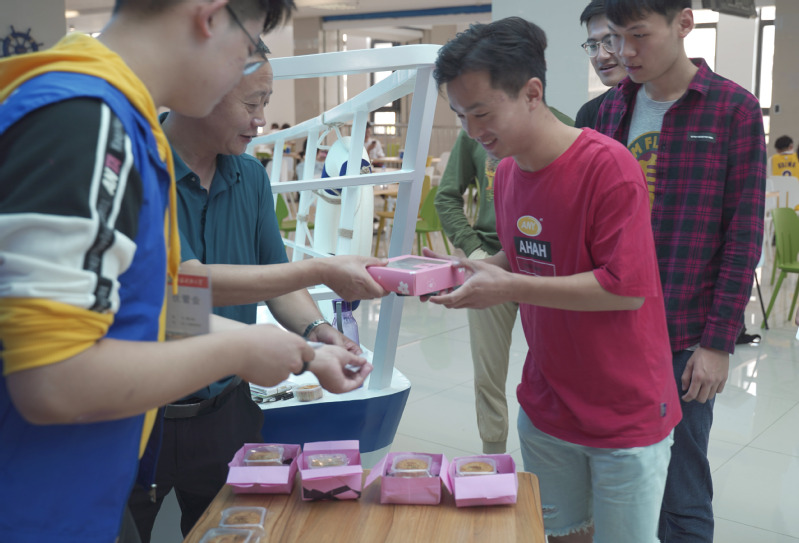 电子信息类新生袭雅洁、唐少敏领到学校特别定制的月饼,非常开心,她们觉得学校特别用心,领月饼的同时还不忘给工作人员送上节日的祝福,她们希望祖国生日快乐,更加繁荣昌盛,也祝愿家人佳节身体健康,万事如意。经管类新生高怡梦收到月饼感到很特别也很开心,她希望佳节大家都能梦想成真。食品类新生张伊欣、于本晴从公众号上了解到学校送月饼的活动,觉得月饼比较精致,虽然没有回家,但是已经与家人视频通话,今天会和室友一起赏月共同欢庆佳节。海洋工程类新生彭硕也觉得学校很用心,应用物理类黄姗姗领到月饼后想保留下来做纪念,她觉得这是节日比较特别的礼物。