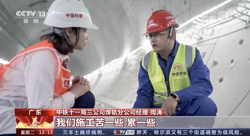 周涛表示,“我们施工苦一些,累一些,一定要保证质量,我们老铁道兵有句话叫‘逢山开路,遇水架桥’,我们这一代继续传承精益求精一丝不苟的精神……”春节假期期间,在广州地铁18号线铺轨建设现场,周涛和他的团队在工地上忙碌着,每天他和工友们都要往地下走约13层楼高的楼梯,在地下40米的隧道里开始轨道焊接工作。周涛所带领的焊轨团队共有65人,他们每天分两个班组进行作业,每天要工作9个多小时。