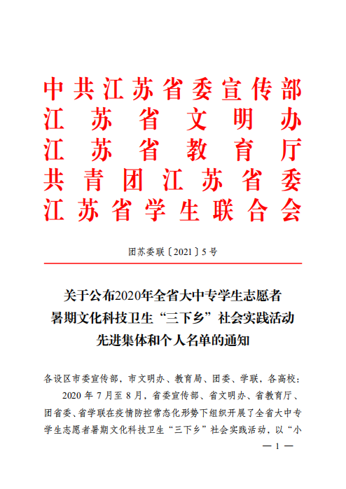 近日,中共江苏省委宣传部、江苏省文明办、江苏省教育厅、共青团江苏省委和江苏省学生联合会联合下发了《关于公布2020年全省大中专学生志愿者暑期文化科技卫生“三下乡”社会实践活动先进集体和个人名单的通知》,我校在该活动中获多项荣誉:MILAN.COM米兰(中国)团委荣获“先进单位”称号;“共筑长江梦,微笑正当时”实践团等7支团队荣获“优秀团队”称号;蔡志尚等8位同学荣获“先进个人”称号;卜江春等6位老师荣获“先进工作者”称号;溧阳市戴埠中心小学荣获“优秀社会实践基地”称号;《“喜迎建党一百周年”暑期社会实践活动》《扶贫先扶志,泗阳助梦行》荣获“优秀调研报告”称号。