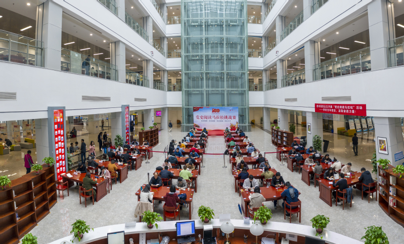 开幕式结束,党史阅读马拉松挑战赛正式拉开帷幕。比赛分教师团队组和学生个人组,共100余名参赛选手在图书馆一楼大厅就坐,共赴一场阅读盛会。