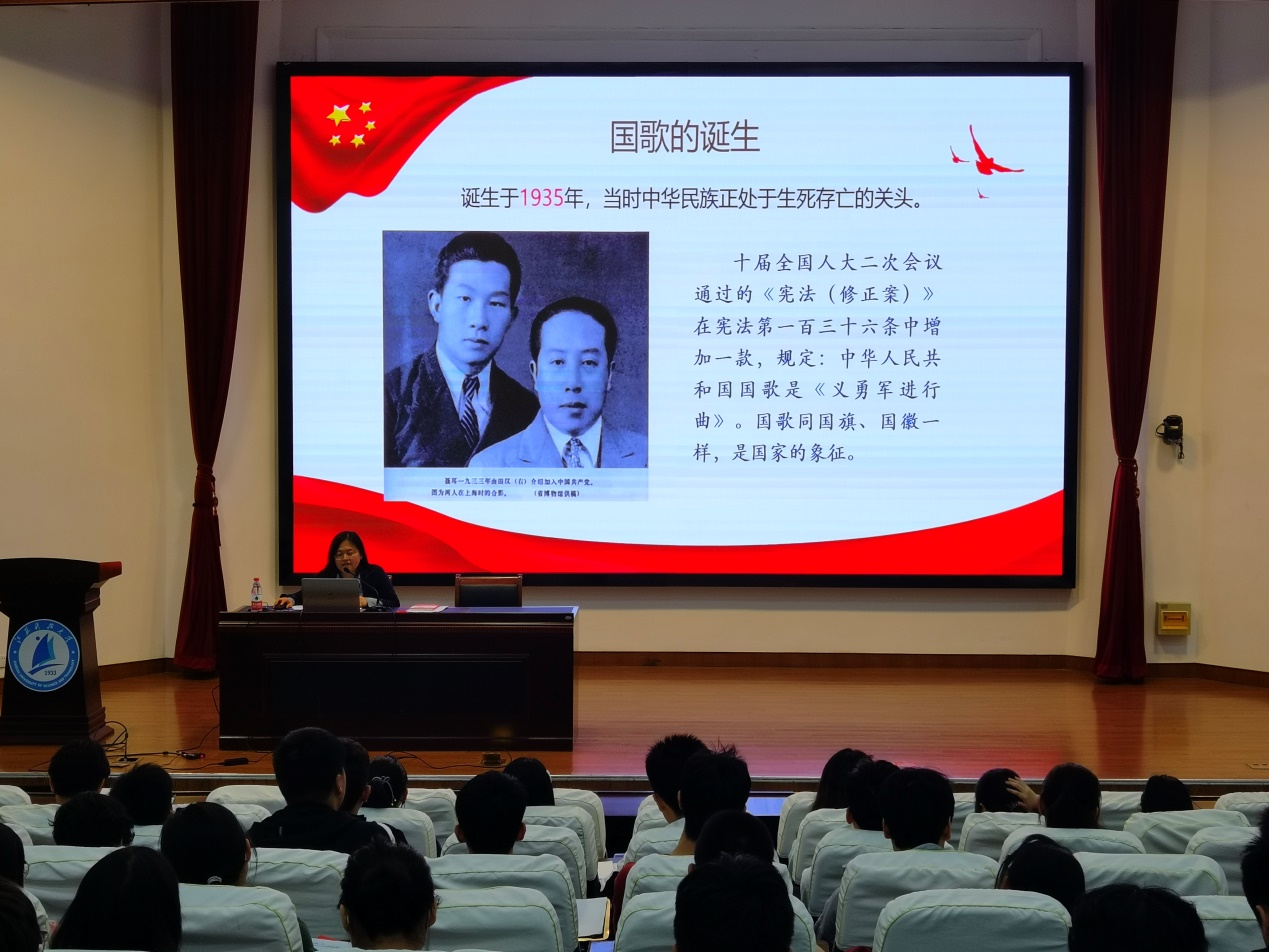 入党积极分子最后一堂集体党课,深蓝学院党总支副书记刘剑老师围绕国歌的由来详细介绍了其诞生的历程、演变和发展。她特别强调,国歌诞生于1935年,中华民族正处于生死存亡的关头。1949年10月1日,毛主席按动升旗电钮,伴随五星红旗冉冉上升,《义勇军进行曲》作为国歌第一次在天安门广场响起。
