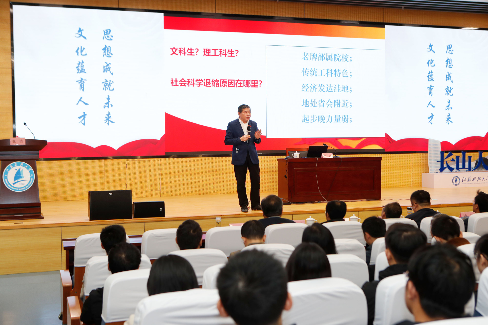 为助力落实江苏高水平大学建设高峰计划建设方案,充分发挥人文社会科学在学校人才培养、文化建设和高质量发展等方面的积极作用,我校“长山人文讲堂”于10月21日正式开讲。校党委常委、副校长谈镇,党委宣传部、人文社科处、图书馆、人文学院、马克思主义学院、理学院、外国语学院、经管学院等相关部门和学院负责人及我校师生500多人参加出席启动仪式。讲座由人文学院院长张浩教授主持。