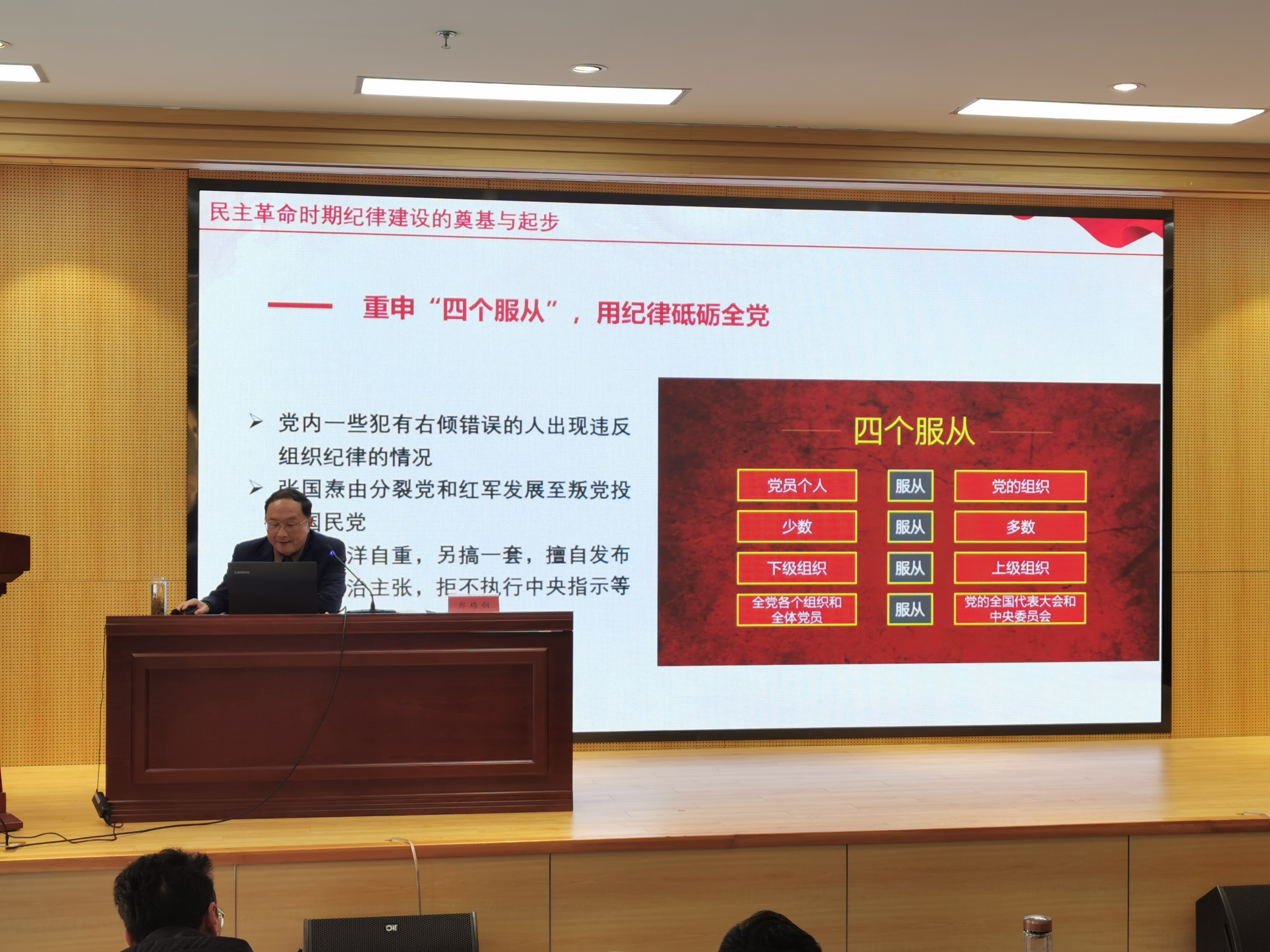 郑培钢的报告以“学习百年纪律史,汲取智慧和力量”为主题,以时间为主线,从民主革命时期、新中国成立后、改革与社会主义现代化时期、党的十八大以来这四个主要时期,讲述了党的纪律建设百年历史,并重点突出四个时期的重要会议、重要事件、重要人物及其影响。