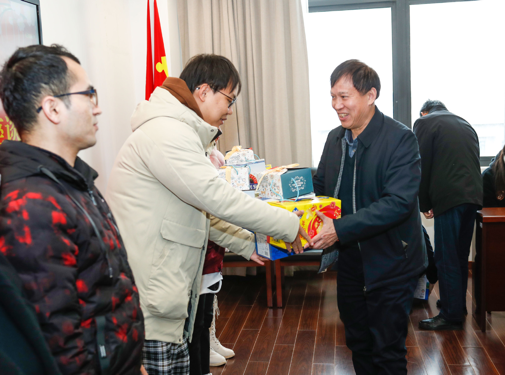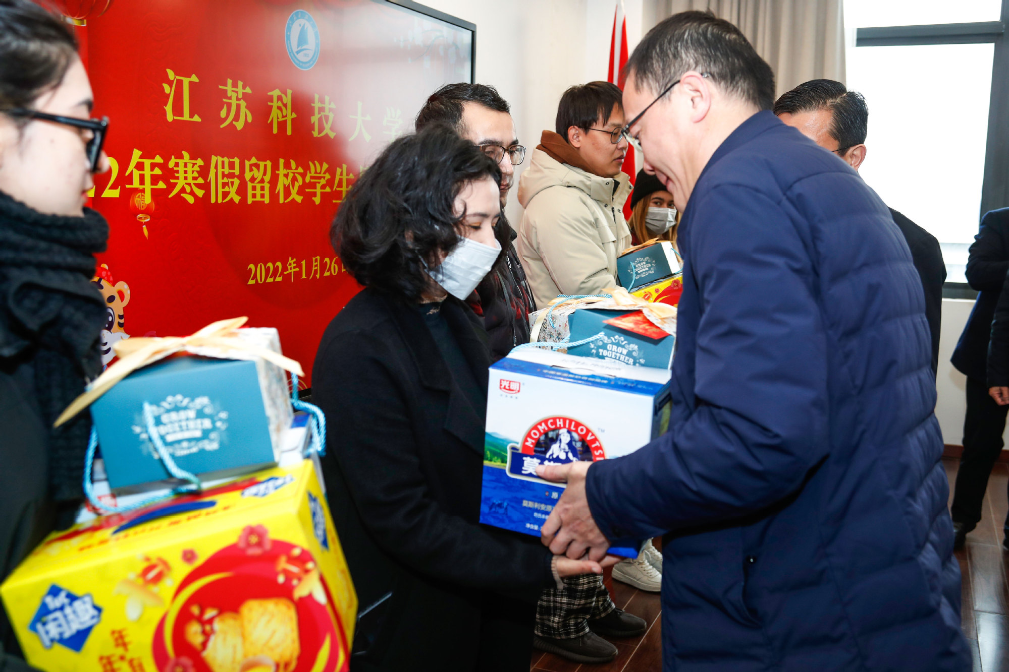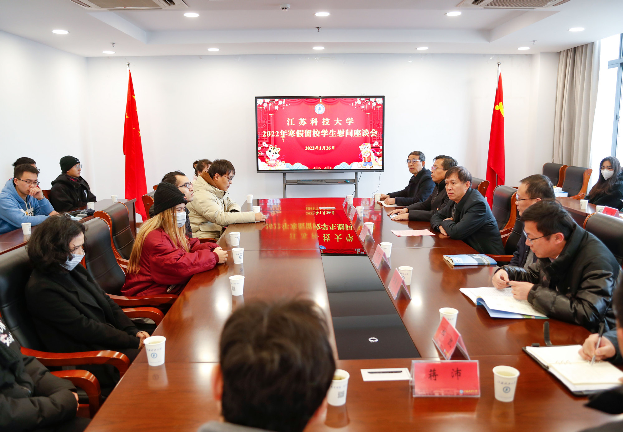 爱心驱寒意,温情暖人心。隆冬岁末的室外严寒凛冽,行政楼8楼会议室里却洋溢着浓浓的暖意。1月26日上午,校党委书记葛世伦,党委常委、副校长汤建,镇江市高校园区建设指挥部副总指挥马士良,高校投资集团副总经理蒋沛看望慰问留校学生,了解留校学生学习生活情况,有针对性地给予指导和帮助,并赠送慰问礼包。