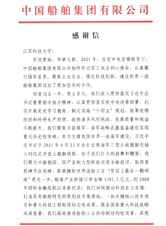 近日,我校收到来自中国船舶集团有限公司的《感谢信》,衷心感谢学校长期以来的关心与支持。感谢信中提到,在充满希望的2022年,期望双方能够发挥各自优势,在船用低速机、智能制造领域进一步展开务实合作,以及高层次人才培养,携手向前、共同开拓,在全面建设社会主义现代化国家新征程上踔厉奋进、勇毅前行!为实现中华民族伟大复兴的中国梦不懈奋斗,以优异成绩迎接党的二十大胜利召开!