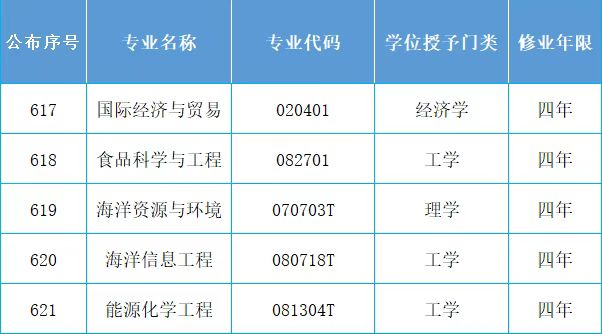 近日,教育部公布了2021年度普通高等学校本科专业备案和审批结果,我校申报的国际经济与贸易、食品科学与工程、海洋资源与环境、海洋信息工程、能源化学工程等5个本科专业全部获批。至此,我校本科专业总数达71个,覆盖工学、管理学、理学等8个学科门类。