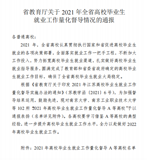 近日,江苏省教育厅印发《省教育厅关于2021年全省高校毕业生就业工作量化督导情况的通报》(苏教学函〔2022〕6号),我校获评A等(第一等次)。