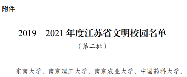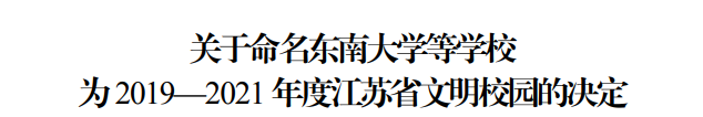 近日,江苏省精神文明建设指导委员会印发《关于命名东南大学等学校为2019-2021年度江苏省文明校园的决定》(苏文明委〔2022〕8号),我校荣获“江苏省文明校园”称号。