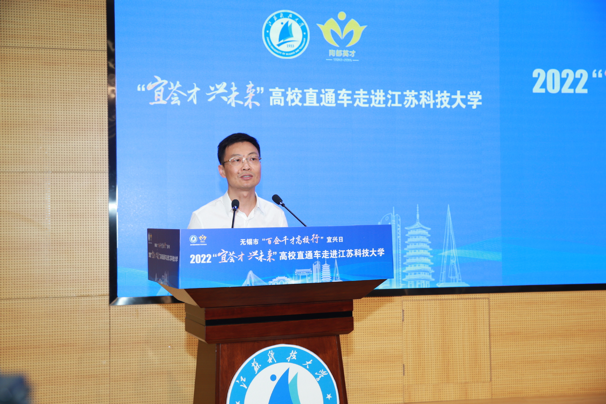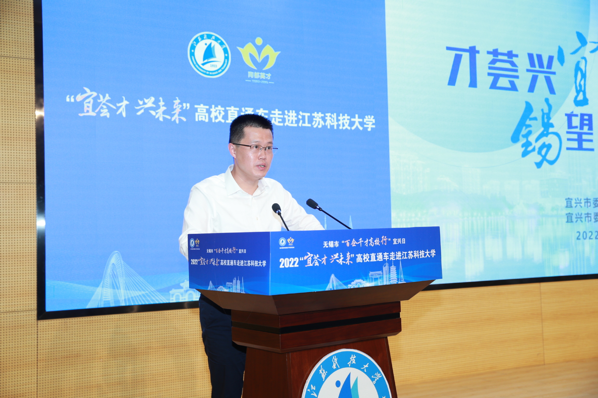 校长周南平和宜兴市委常委、组织部长钱怡分别致辞。周校长在致辞中提到,几年来,学校积极引导推荐高层次人才携科技成果到宜兴创新创业、开展科技孵化,推荐大量本硕博毕业生到宜兴就业创业,学校的人才链和宜兴的产业链正在深度融合,校地之间已经形成一批卓有成效的合作成果。未来我们将充分发挥学校科技和人才资源优势,打造人才培养、科学研究、社会服务的全面合作平台,为“强富美高”新宜兴建设贡献更大的力量。作为校长,培养高素质复合型人才是我的职责和使命,我愿为江科大毕业生代言,我们的学生秉承“船魂”精神,吃得了苦、扎得下根、聚得齐心、干得成事,一定是建设大美宜兴的生力军。作为宜兴人,家乡的繁荣发展是我的自豪和骄傲,我也愿为我的家乡代言,希望学校高端人才和广大毕业生到宜兴去成就梦想,奔赴人生最美的未来!学校将以本次活动为契机,打造校地融合创新发展新标杆,期盼校地合作、校企合作在宜兴这块宝地生根发芽、开花结果。