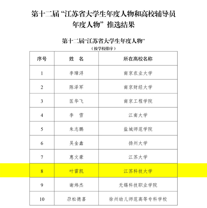 近日,江苏省委教育工委、省教育厅公布了第十二届“江苏省大学生年度人物和高校辅导员年度人物”暨2022年“最美大学生”“最美高校辅导员”推选结果,我校环境与化学工程学院2021级硕士研究生叶雷凯荣获第十二届江苏省“大学生年度人物”。