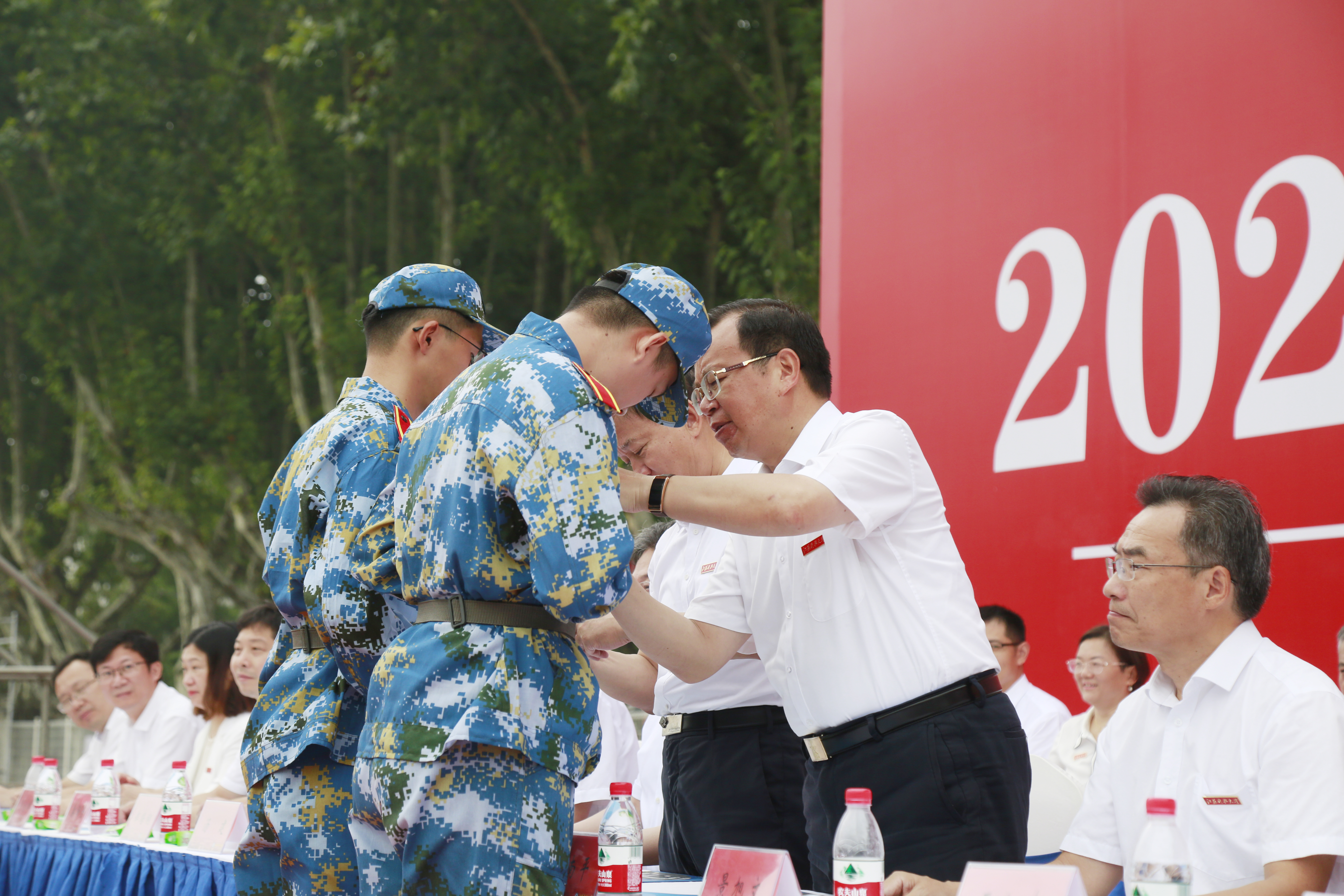 在全场热切瞩目中,葛世伦书记、周南平校长为新生代表颁授校徽,祝贺2022级新生在江科大开启知识探索之旅,与学校结成紧密相关的命运共同体。