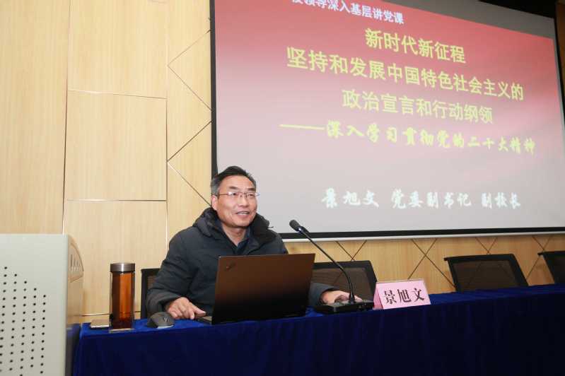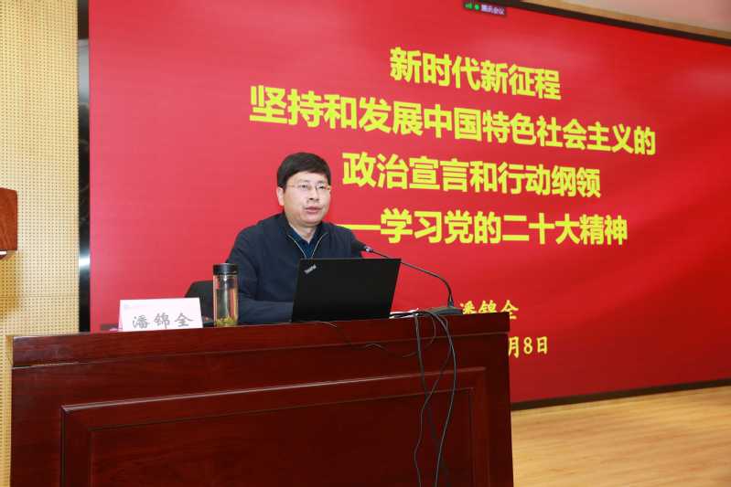 党委常委、副校长潘锦全以《新时代新征程坚持和发展中国特色社会主义的政治宣言和行动纲领》为题,为土建学院和外国语学院的教师代表和学生党员解读党的二十大精神。潘锦全围绕党的二十大报告的基本框架、战略定位、大会主题、实践基础、理论指导、基本路径、根本保证、团结要求等八个方面阐述了党的二十大精神实质和重要影响,强调广大党员特别是党员领导干部要明确使命担当,把党的二十大精神转化为指导实践、推动工作的强大力量,用发展的眼光把党的二十大精神学到深处、落到实处。
