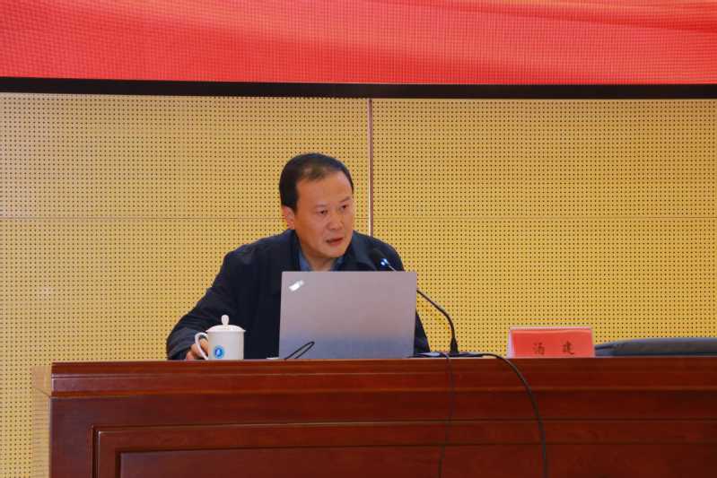 党委副书记汤建为环境与化学工程学院、粮食学院全体教师和学生代表作了题为《不断开辟马克思主义中国化时代化新境界》的报告。汤建结合世界近现代史、中国近现代史和党史等史实依据,简明阐述了大会召开的背景、主题、意义,详细梳理了党的二十大报告结构布局,全面、系统、深刻地解读了党的二十大报告的主要内容。他要求大家要深入学习贯彻党的二十大精神,牢牢把握习近平新时代中国特色社会主义思想的世界观和方法论,不断谱写马克思主义中国化时代化新篇章,为学校的进位争先和高质量发展作出贡献。
