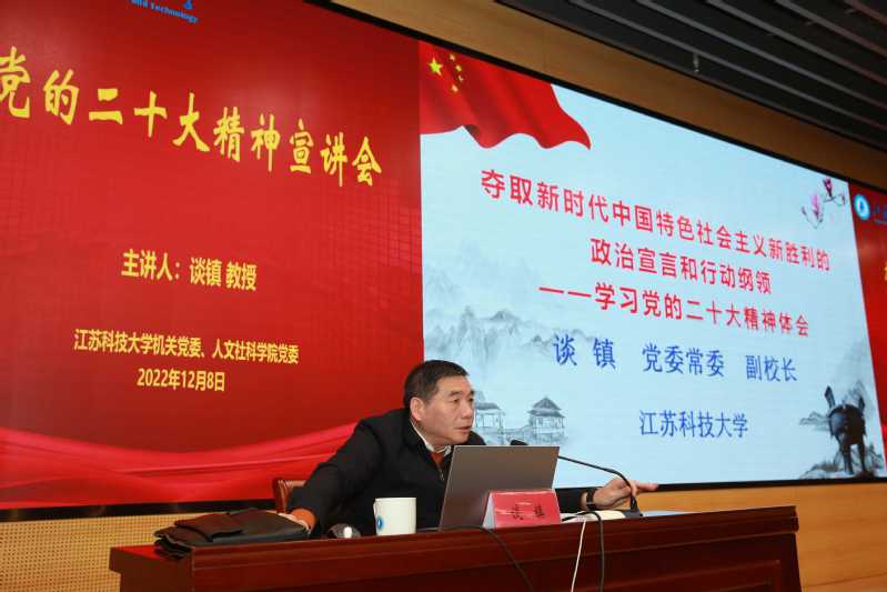 党委常委、副校长谈镇为机关党委、人文社科学院师生做题为《夺取习近平新时代中国特色社会主义思想新胜利的政治宣言和行动纲领》的专题报告。谈镇运用哲学思想,指出“十个明确”“十四个坚持”“十三个方面成就”,是一个逻辑严密的思想整体。他认为,党的二十大报告对教育、科技、人才工作的定位达到新的高度,广大党员、教师要切实把学习成果转化为推动学校高水平大学建设的强大动力。他号召全体师生要坚定信心、同心同德,埋头苦干、勇毅前行,为全面建设社会主义现代化国家而团结奋斗!