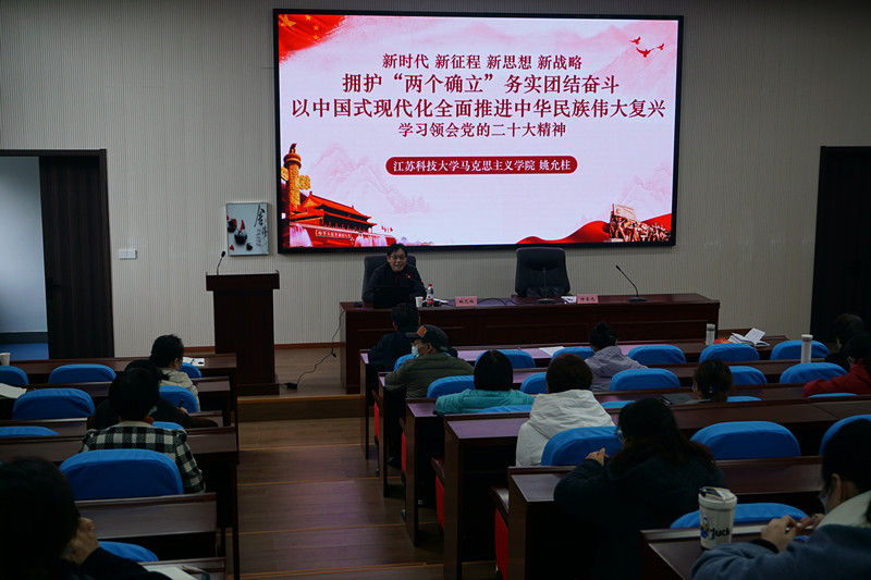 党委常委、宣传部部长周春燕为能动学院、船海学院全体教职工、学生党员代表作党的二十大精神宣讲报告。周春燕围绕党的二十大召开的重大意义、党的二十大主题、党的二十大报告的结构布局以及主要内容等方面,对党的二十大提出的新思想新论断、作出的新部署新要求进行了系统解读和深入阐释。