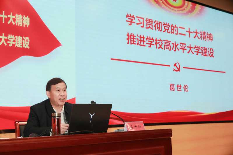 党委书记葛世伦为经管学院全体师生开展了以《学习贯彻党的二十大精神,奋力推进高水平大学建设》为主题的党的二十大精神宣讲。葛世伦围绕党的二十大的主题、历程和成果、党的二十大的意义、过去五年的工作和新时代十年的伟大变革、习近平新时代中国特色社会主义思想的世界观和方法论、以中国式现代化推进中华民族伟大复兴的使命任务、以伟大自我革命引领伟大社会革命的重要要求、团结奋斗的时代要求等方面介绍了党的二十大的内容,并逐条分析党的二十大精神对学校建设高水平大学的指导意义,鼓励全体师生更加努力学习党的二十大精神,以党的二十大精神武装思想、提升精气神,充分发挥每一个江科大人的潜力,立足优势专业,助力学校早日登上更高的层次。