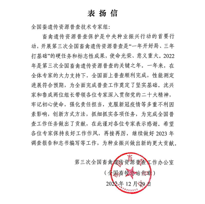近日,我校全国蚕遗传资源普查技术专家组收到来自第三次全国畜禽遗传资源普查工作办公室的表扬信,信中对专家组成员一年来为完成全国普查工作任务做出的贡献表示感谢,同时希望各位专家保持良好工作作风,再接再厉,继续做好2023年调查报告和志书编写等工作。