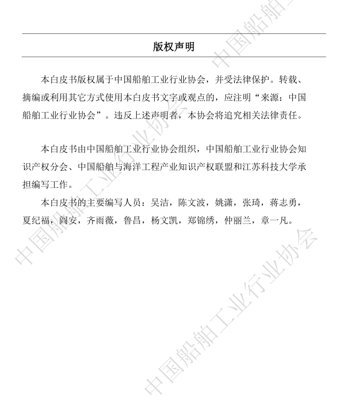 《白皮书》由中国船协组织编写,从较长的历史维度展现了中国船舶工业企业在知识产权领域的发展情况。这也是中国船协首次发布知识产权白皮书,旨在鼓励产业链各主体和国内外船舶工业企业增强交流、深化合作,共同促进优秀创新成果的转化和提高知识产权的运用、保护水平。