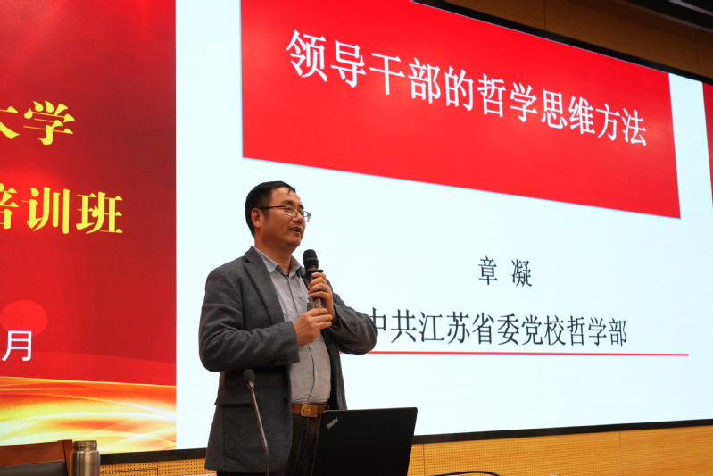 18日下午,江苏省委党校哲学教研部教授、马克思主义理论教学中心主任章凝应邀为我校干部主讲《领导干部的哲学思维方法》。章凝教授从历史与现实、国内与国际两个维度,阐述了“哲学是什么”、“领导干部为什么要学点哲学”,着重解读了领导干部哲学思维的四种向度,认为干部的思维要有长度、宽度、深度以及高度,应当具备历史思维、系统思维、辩证思维、底线思维和战略思维,要不断提升驾驭复杂局面、处理复杂问题的本领。他论述了哲学思维对领导干部的方法论意义,指出求真务实是基本立场,开拓创新是主要方法,解决矛盾是最终目标,强调干部要有问题意识,强化问题导向,激励干部们发扬钉钉子精神,踏石留印、抓铁有痕。章教授的讲座坚持用马克思主义哲学的立场、观点和方法谋划事业发展,将培养干部哲学思维作为提升思想认识水平的根本途径和推动工作的制胜法宝,对我校领导干部进一步加强政治理论素养、提升管理能力水平,广泛统一思想、凝聚共识,具有深远的实践借鉴意义。