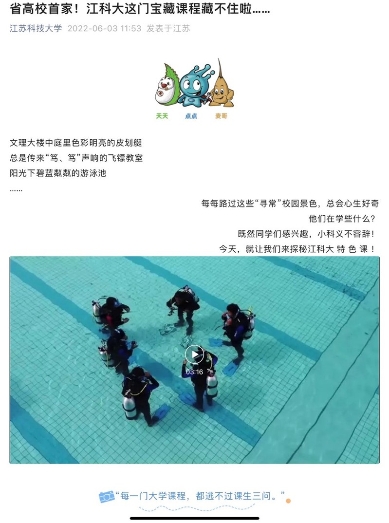《省高校首家!江科大这门宝藏课程藏不住啦……》一文由我校大学生通讯社记者采写,以视频、图片、文字相融合的方式报道了学校开设的特色潜水课程,语言生动、主题突出,内容丰富、形式新颖,兼具新闻的重要性和趣味性。