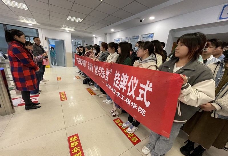 为促进学生养成良好的生活习惯,发挥学生党员在宿舍管理中的示范引领作用,共同营造健康文明、积极向上的校园宿舍文化,4月6日下午,环境与化学工程学院举行“文明宿舍创建月”启动暨“党员宿舍”挂牌仪式。学院党委书记袁爱华、后勤集团副总经理居凌云、学院全体辅导员以及各班级学生代表、党员代表50余人参加了启动仪式,仪式由学院党委副书记王召征主持。