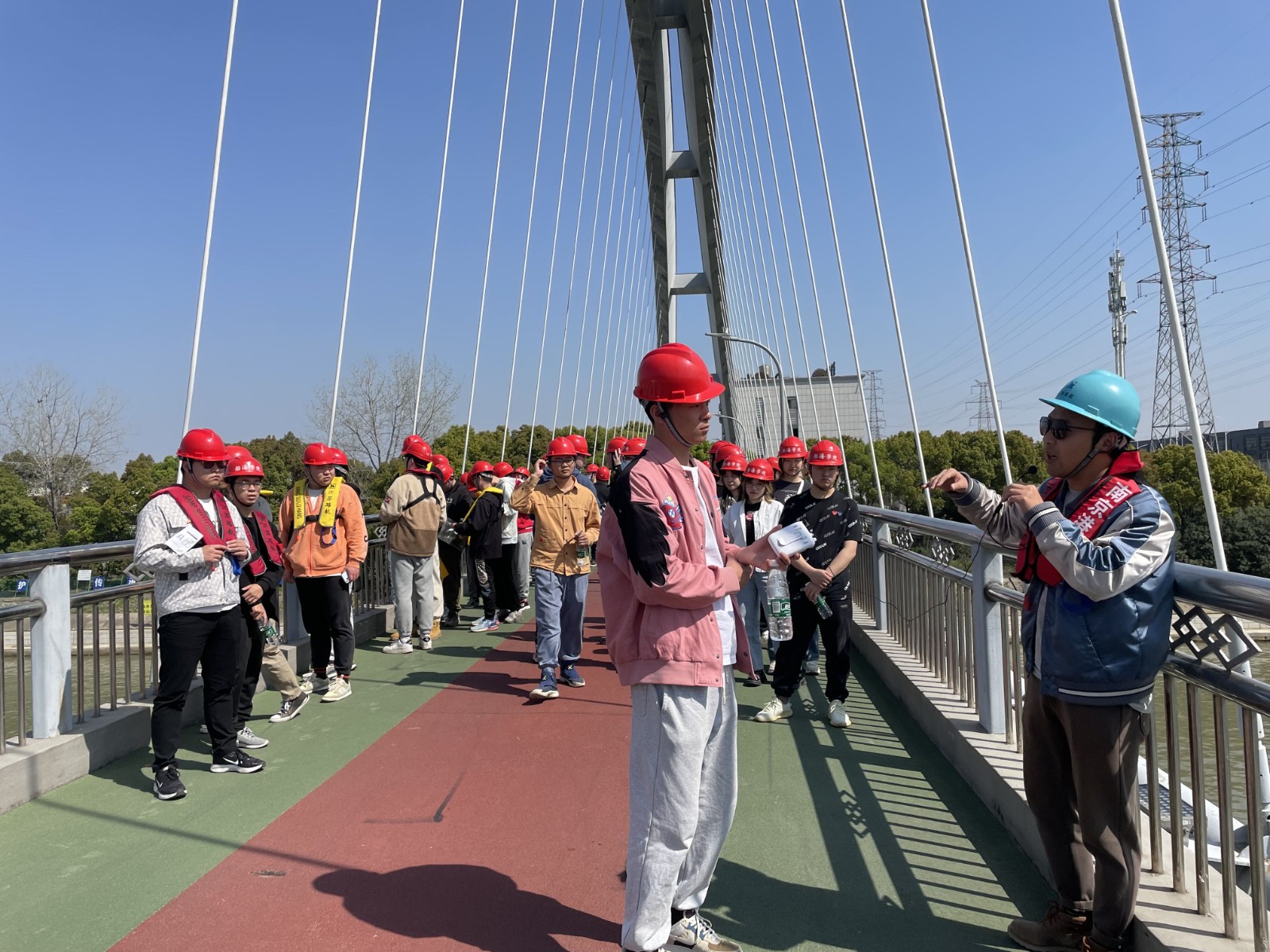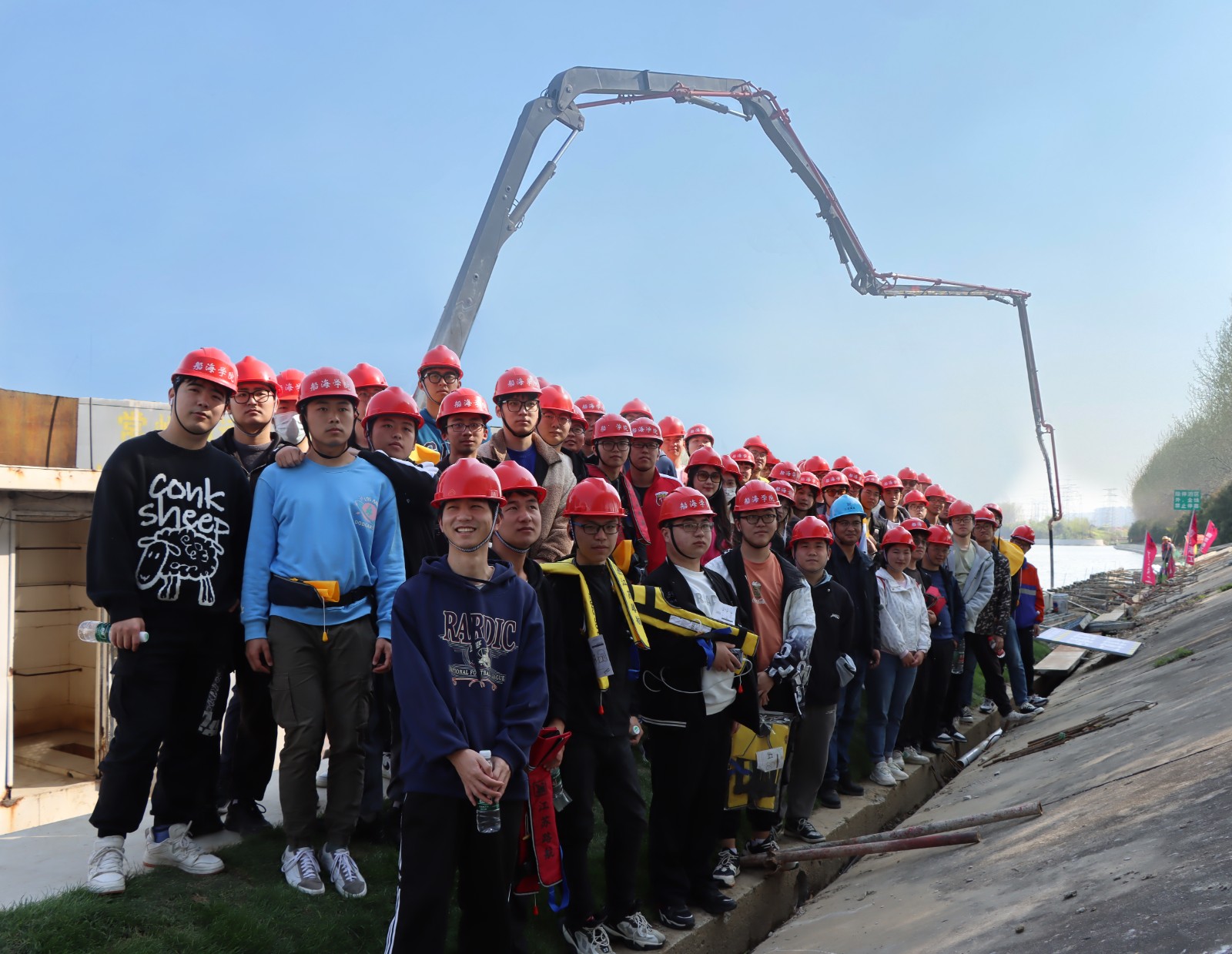 本次实习,在江苏路航建设工程有限公司副总经理潘兴、副总经理徐家祥的带领下,港航专业师生来到了常州航道整治工程的航道驳岸、工地现场,并与现场施工人员进行了热烈的讨论。紧接着,港航师生登上了“恒远6号”特种施工作业船舶(水上混凝土生产泵送一体工作船),“恒远6号”负责人揭新华总设计师为同学们详细讲解了该船舶的生产与操作流程,赢得了同学们阵阵掌声。