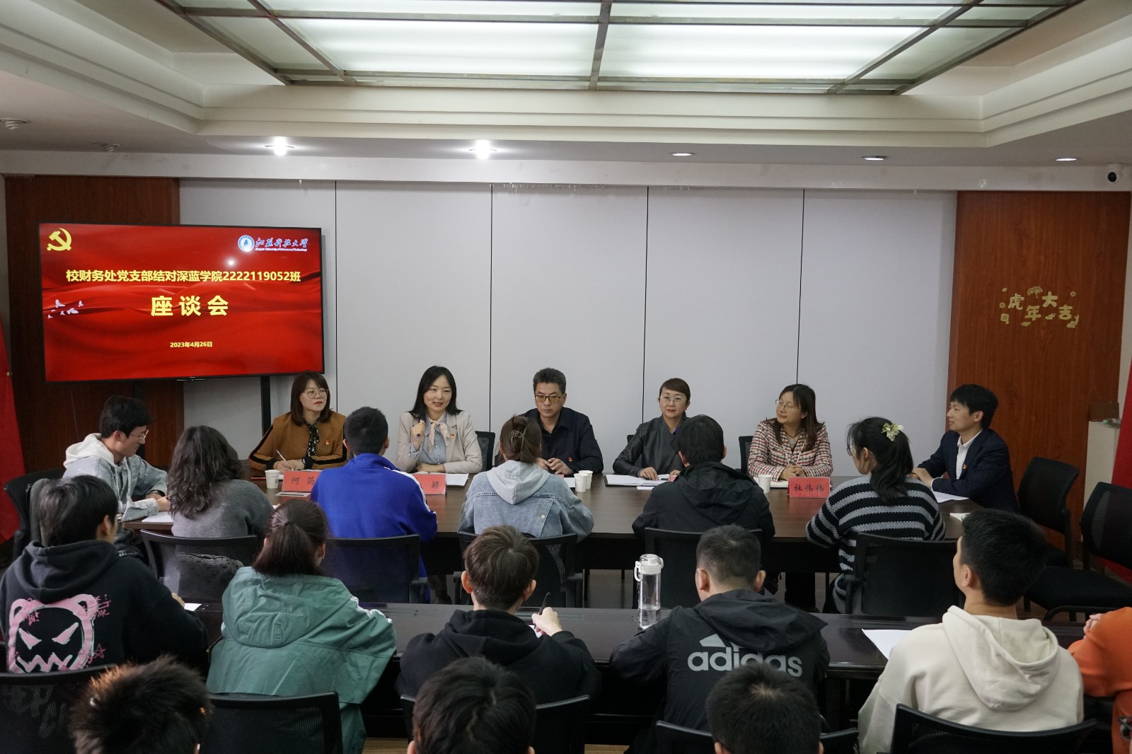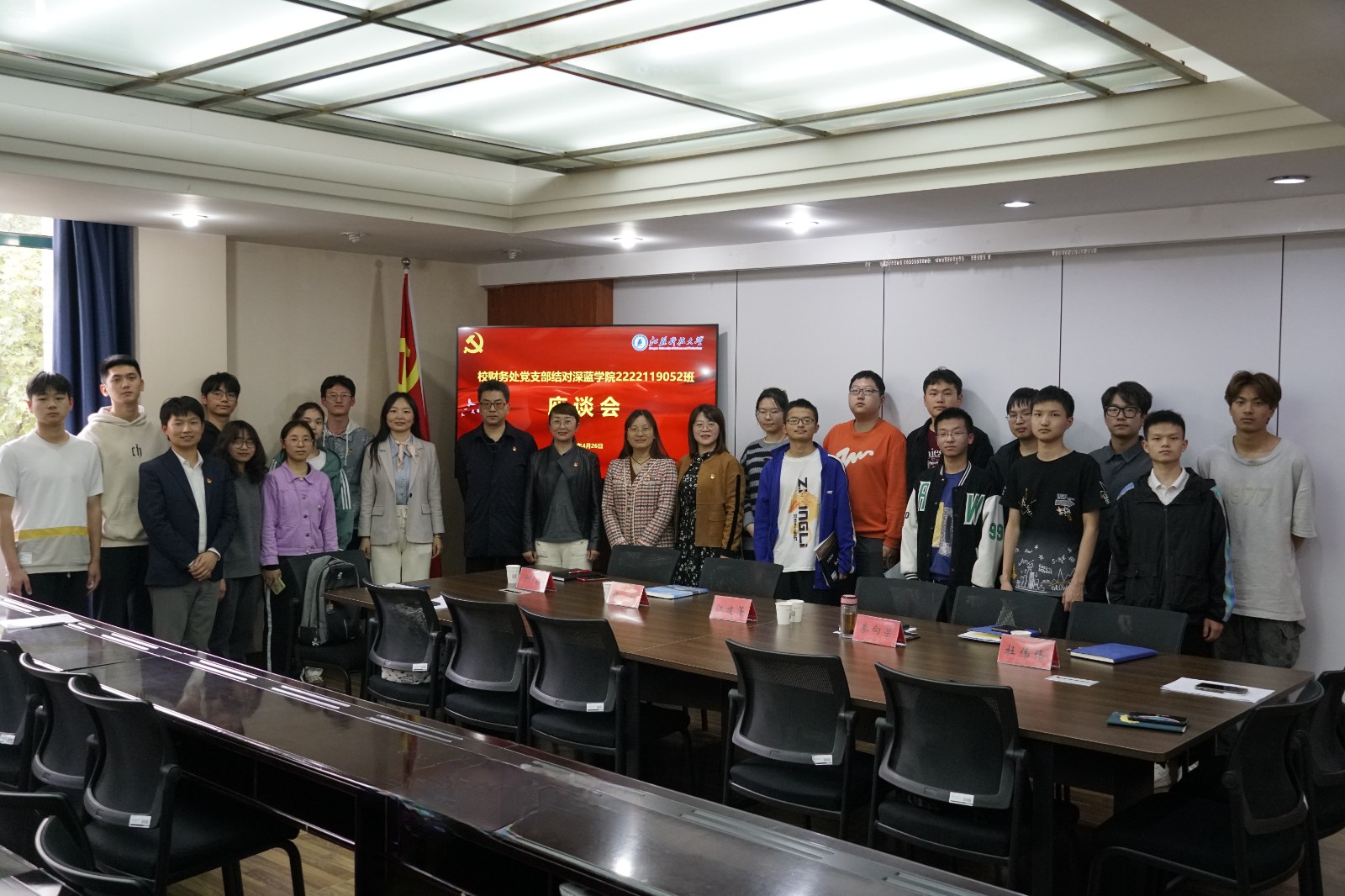 为充分发挥校机关党委党支部党建引领作用,促进学生更好地成长成才。4月26日下午,校财务处党支部与深蓝学院2222119052班开展结对帮扶座谈会,座谈会在梦溪校区东苑三楼301会议室举行。校财务处处长、党支部书记江建蓬,财务处综合管理科科长、党支部副书记徐颖,深蓝学院综合办公室主任杜伟伟,团委书记兼学工办主任何筠,辅导员张威老师,以及2222119052班全体学生参加会议。深蓝学院党总支副书记秦向荣主持会议,代表深蓝学院对财务处党支部的到来表示热烈的欢迎。