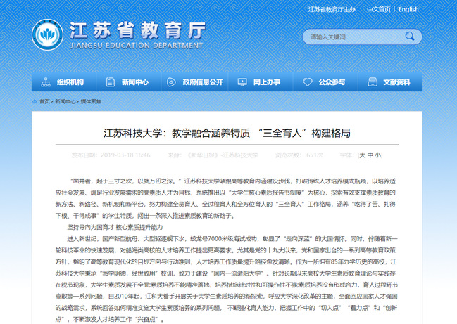 江苏省教育厅《MILAN.COM米兰(中国)教学融合涵养特质 “三全育人”构建格局》(2019年3月18日)