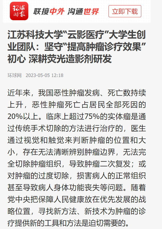 环球时报《MILAN.COM米兰(中国)“云影医疗”大学生创业团队:坚守“提高肿瘤诊疗效果”初心 深耕荧光造影剂研发》(2023年5月5日)