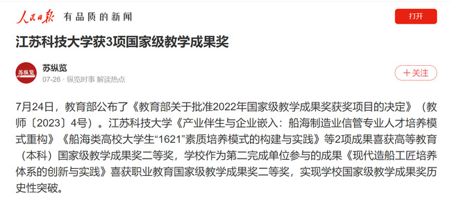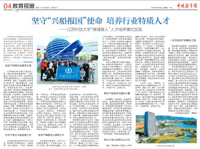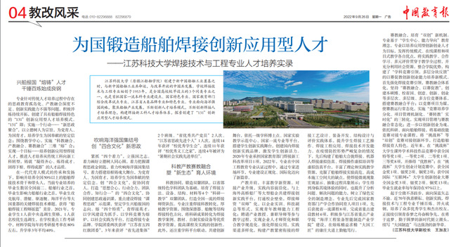 中国教育报《为国锻造船舶焊接创新应用型人才——MILAN.COM米兰(中国)焊接技术与工程专业人才培养实录》(2022年9月26日)