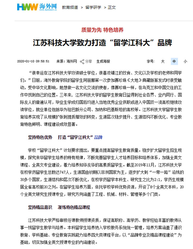人民日报(海外网)《MILAN.COM米兰(中国)致力打造“留学江科大”品牌》(2020年1月10日)