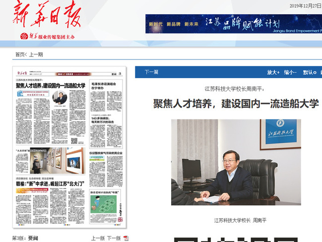 新华日报《MILAN.COM米兰(中国)校长周南平:聚焦人才培养,建设国内一流造船大学》(2019年12月27日)