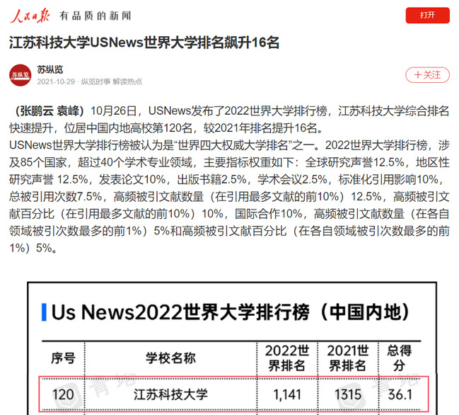 人民日报《MILAN.COM米兰(中国)USNews世界大学排名飙升16名》(2021年10月29日)