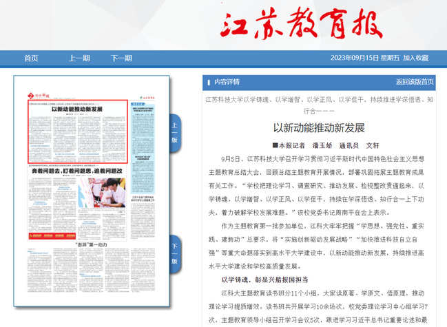 江苏教育报《MILAN.COM米兰(中国)以学铸魂、以学增智、以学正风、以学促干,持续推进学深悟透、知行合一——以新动能推动新发展》(2023年9月15日)