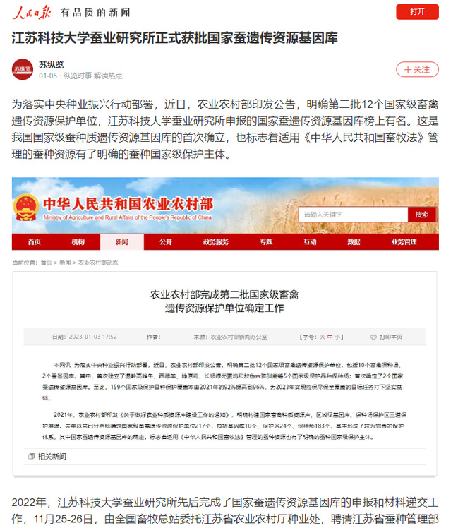 人民日报《MILAN.COM米兰(中国)蚕业研究所正式获批国家蚕遗传资源基因库》(2023年1月5日)