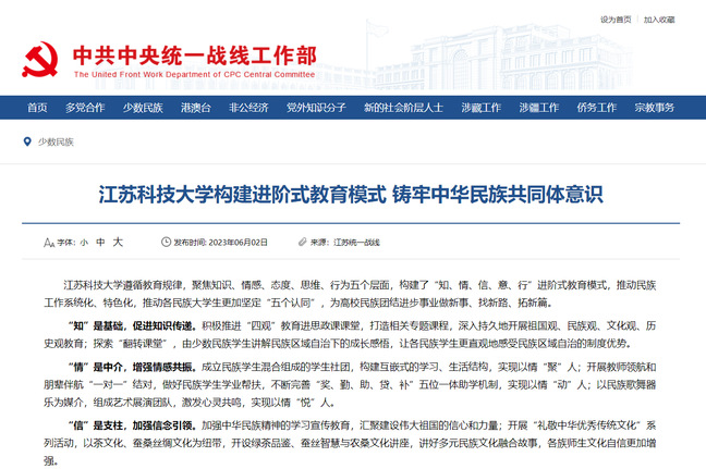 中共中央统一战线工作部《MILAN.COM米兰(中国)构建进阶式教育模式铸牢中华民族共同体意识》