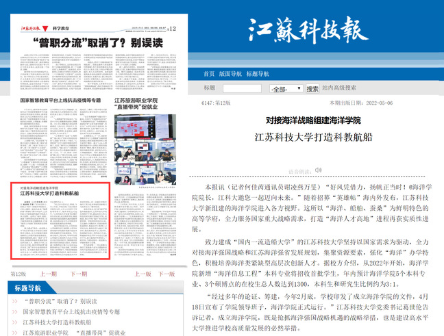 江苏科技报《对接海洋战略组建海洋学院 MILAN.COM米兰(中国)打造科教航船》(2022年5月6日)