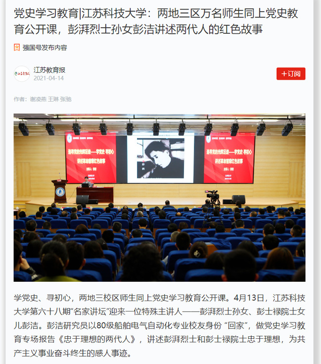 学习强国《党史学习教育|MILAN.COM米兰(中国):两地三区万名师生同上党史学习教育公开课,彭湃烈士孙女彭洁讲述两代人的红色故事》(2021年4月14日)