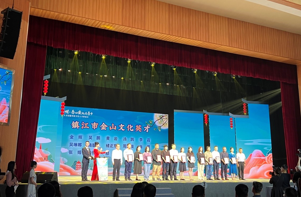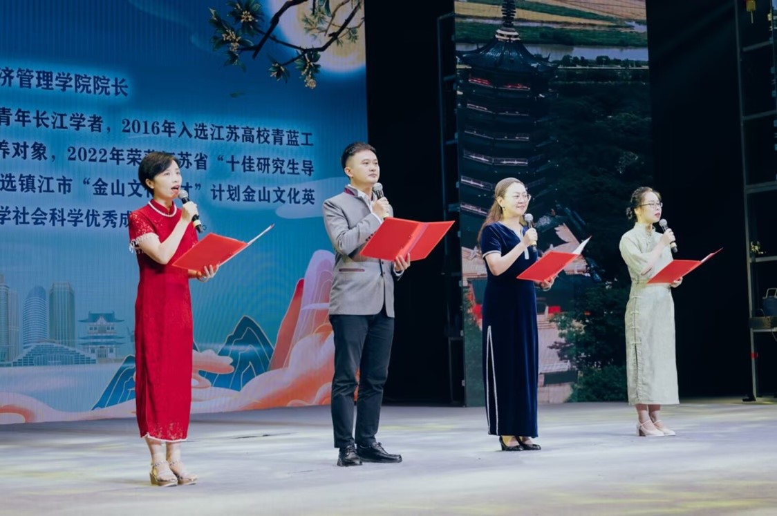 活动现场,相关领导为2023年“镇江市金山文化名家”“镇江市金山文化优青”“镇江市金山文化英才”“镇江市第六期‘169工程’学术技术新秀”等文化人才颁发了奖牌和证书。本次我校教师金辉教授增补为镇江市金山文化英才。此前,我校教师王念新、孟庆良教授及江雪博士获首期金山文化英才,徐兰教授获首期金山文化优青。徐兰教授受邀参加诗朗诵节目表演,与其他三位金山文化人才一起朗诵诗歌《满目俊杰,意兴飞扬》,用铿锵有力的声音,讲述镇江这座历史文化名城的古往今来。