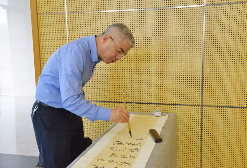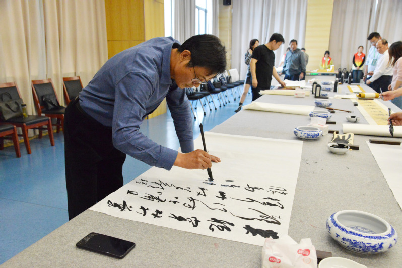 古韵绵长的音律流动中,书画家们满怀对艺术的热爱和激情,以现场创作的方式展现中国传统书画艺术的魅力。他们泼墨敷彩,各展所长,或笔走龙蛇,或落纸云烟,神畅气贯各得其法,挥洒意气激情奔放,将对艺术的深刻理解和对学校的诚挚祝福欣然倾注笔端。经过数小时的现场创作,书画家们为学校90周年创作了近百幅书法、绘画作品。这些作品承古创新,形殊趣异,各美其美,相映成趣,用书画立言,以笔墨承意,对学校的办学理念和特色进行了生动鲜活的演绎和诠释,展现了精湛的艺术修为和造诣,充分体现了中国书画艺术的用笔韵味和意境之美。以笔会友、集中创作的浓厚氛围还进一步激发了书画艺术家们的创作热情,他们凝神挥毫,渐入佳境,一度进入了心无旁骛浑然忘我的艺术创作境界,佳作纷呈,蔚为大观。大家在艺术的探讨和品鉴中相谈甚欢,流连忘返,才思与灵感在这里碰撞,气韵与风雅在这里交融,现场气氛欢快而热烈。