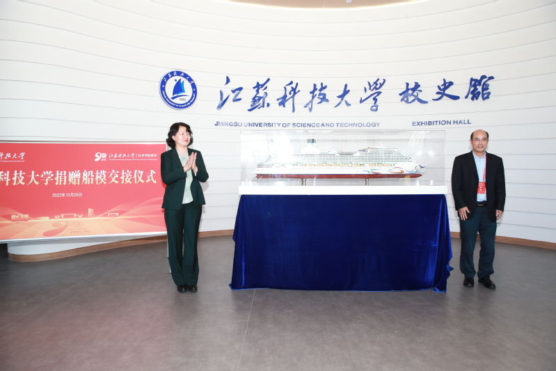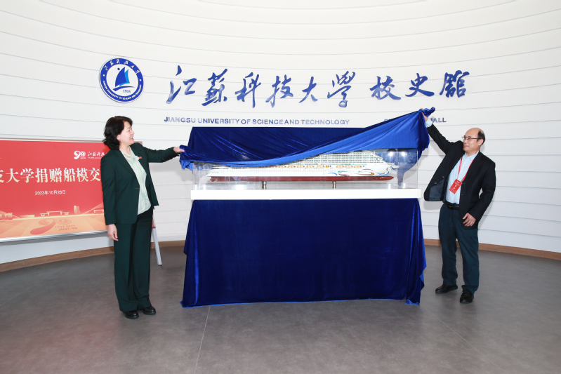 嵇春艳校长和刘建峰总工艺师代表校企双方共同为捐赠的“爱达魔都号”豪华游轮模型揭幕。