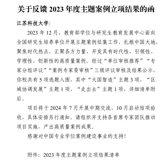 中国专业学位案例中心由教育部学位与研究生教育发展中心设立,是我国相关专业学位类别最全、特色鲜明、广受认可并具有一定国际知名度的国家级专业学位教学案例中心。2023年主题案例设立“大国智造”“中华传承”“区域协调发展”“走出去”四个主题,旨在汇聚各方力量,聚焦时代热点,开发具有时代性、引领性、学理性的高质量案例,充分展现中国特色理论与实践成果。自2023年12月征集工作开始,研究生院高度重视,注重发挥学校“船舶”“海洋”“蚕桑”学科特色与优势,精心组织遴选,认真打磨申报材料,经过“单位审核推荐”“专家分组评议”“案例专家委审核确认”三级评审,实现了我校该项目连续两年立项数量的突破。