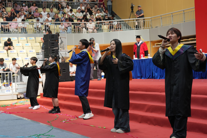 在书记的祝福中,万千彩带从天而降,将这闪耀的时刻装点得更加缤纷绚烂。伴着掌声,毕业典礼告一段落。中场休息时,大学生艺术团的同学们用充满青春活力的歌声表达了对毕业生的真挚祝愿。