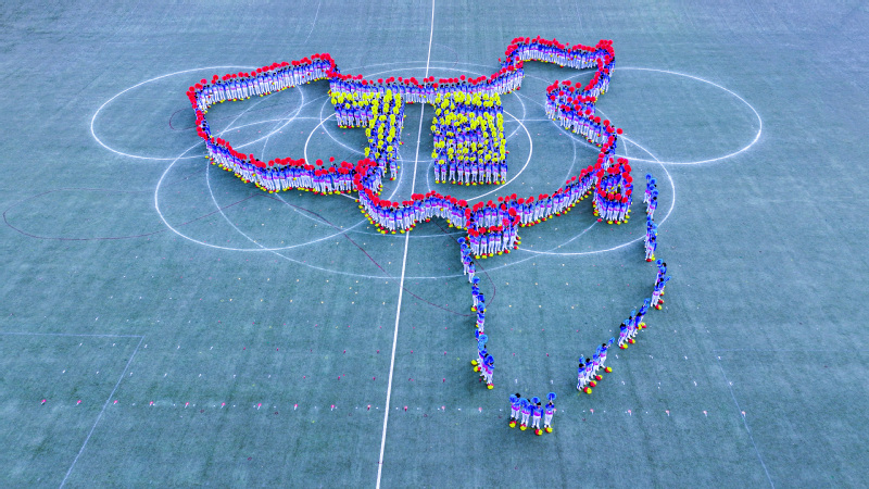 “砥砺前行七十五载,共绘祖国时代新篇!”,来自材料科学与工程学院的500余名学生带来了“奔跑吧,江科大”团体操表演。绿茵场上,同学们用不同颜色绘制出校徽的船帆图案,表达了大家对学校继往开来、大展宏图的祝福。大家手拉手,心连心,从四面八方迅速聚拢,如同星星点点汇聚成光海一片,以不可阻挡之势汇聚成一幅壮丽的祖国图案,那是对伟大祖国的深情礼赞。每一代江科大人,都无畏前行,大家绽放的生命之花,永远挺立在家国的枝头!