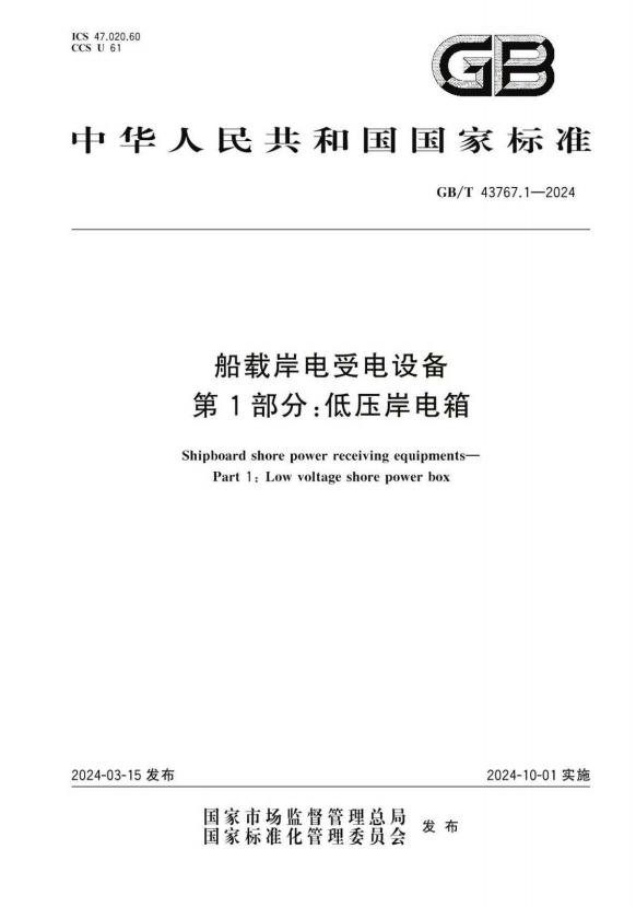 岸电系统中高压与低压的技术条件不同,在设计、制造、检验以及使用方面区别较大,国际、国内关于港口岸电供电设施建设的规范标准,都分为高压岸电系统与低压岸电系统两个部分。与此对应,GB/T43767由两个部分构成,标准《GB/T 43767.1-2024  船载岸电受电设备 第1部分:低压岸电箱》规定了交流低压岸电箱的分类与型号标记、技术要求、试验方法、检验规则以及包装、运输及贮存等,适用于系统标称电压不超过交流1kV、额定频率为50/60 Hz、额定电流不超过1600 A的交流低压岸电箱的设计、制造、检验与应用。标准《GB/T 43767.2-2024  船载岸电受电设备 第2部分:高压岸电箱(柜)》规定了系统标称电压超过1kV且不超过15kV、额定频率为50/60 Hz、额定电流不超过4000 A的交流高压岸电箱(柜)的分类与型号、技术要求、试验方法、检验规则以及包装、运输及贮存等。