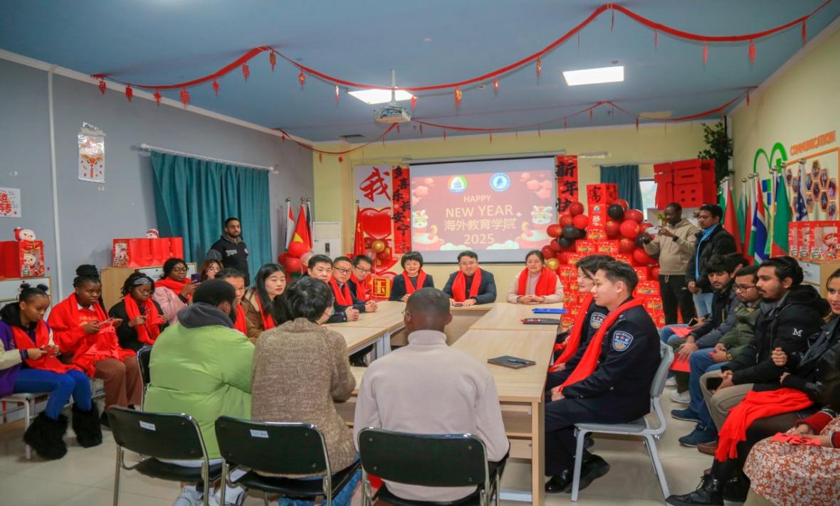 福拓迎春,弘扬中华优秀传统文化。2025年春节为首个“非遗年”,为展示春节习俗的深厚文化内涵,让留学生亲身体验中国传统年味年俗,海外教育学院精心策划开展 “迎新年,送祝福”活动。党委常委、副校长周宏根,镇江市出入境管理支队、丹徒司法局、民进镇江市丹徒支部及学校海外教育学院的主要领导和工作人员与留学生共庆首个“非遗年”。周宏根代表学校向来华留学生送上新春祝福,让大家深切感受春节的热烈氛围和深深温情。